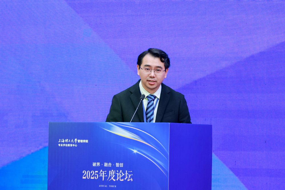 12月12日下午,上海理工大学管理学院在军工路校区举办“破界·融合·智创 共筑产教融合新生态”2025年度论坛。校党委书记王凌宇,规划发展处处长宇振盛,校友工作联络处处长曲德强,研究生院副院长郑继红,霍尼韦尔(中国)总裁余锋校友,经纬创投合伙人、黄浦区政协委员唐磊校友,上海联创投资管理合伙人朱一凡,上海国创投资有限公司董事长、上海蓝丝带公益基金会理事长白俊平校友,管理学院党政领导等出席活动。论坛吸引近200名师生与校友代表现场参会,另有两万余人次线上同步观看直播。开幕式由管理学院党委书记马静波主持。