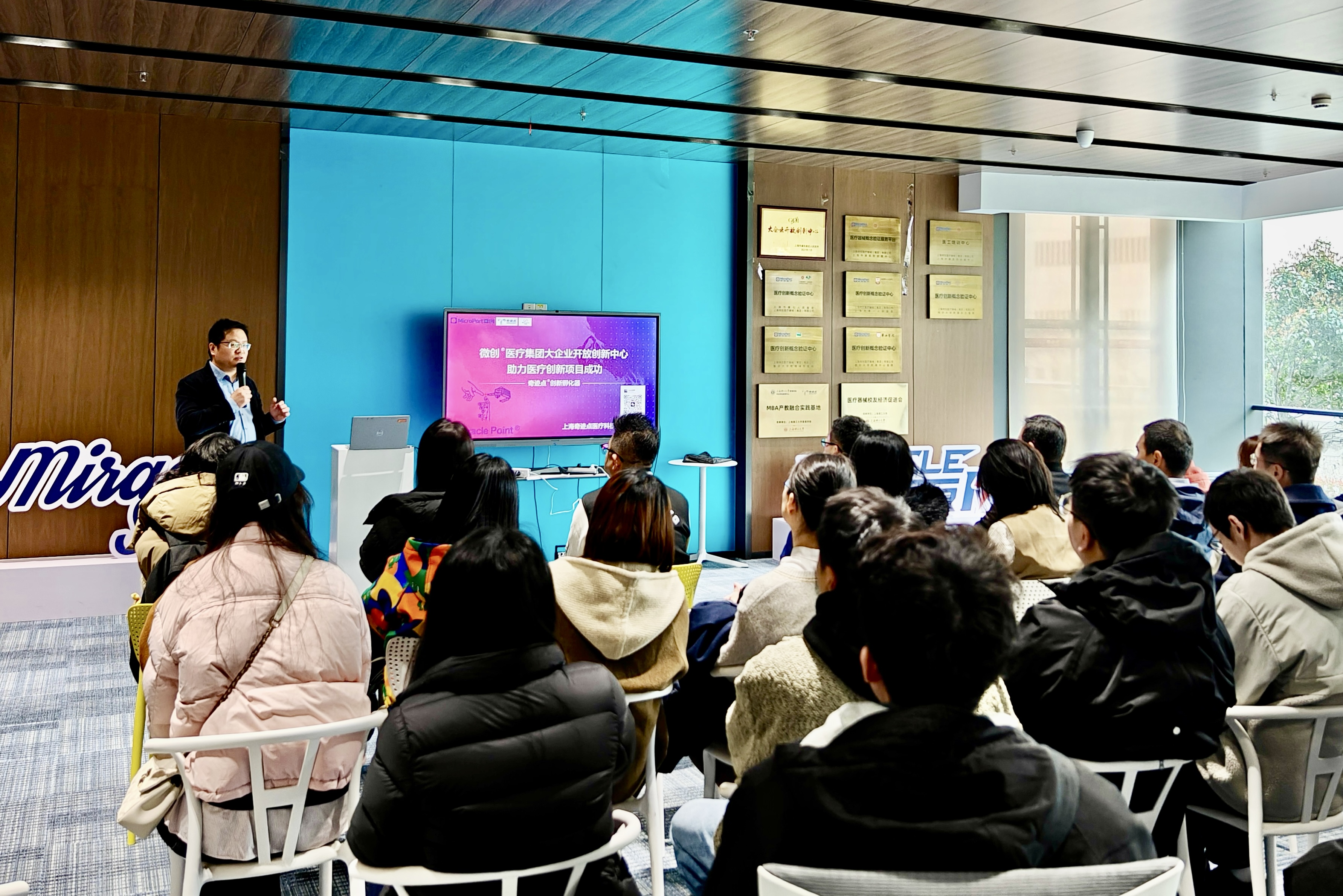 3月15日上午,上海理工大学管理学院专业学位教育中心组织MBA师生赴产教融合实践基地微创医疗开展专业实践参访活动。本次活动旨在深化校企合作,推动产教融合,助力MBA学子在实践中开拓视野、提升综合素养。MBA项目主任张峥,上理“MBA微理班”班主任、上海蓝湾科创集团合伙人、上海理工大学第三届MBA校友会会长踪家武,以及中心相关教师一同参与。微创奇迹点孵化器plus执行副总经理张海建热情接待并全程陪同参观交流。