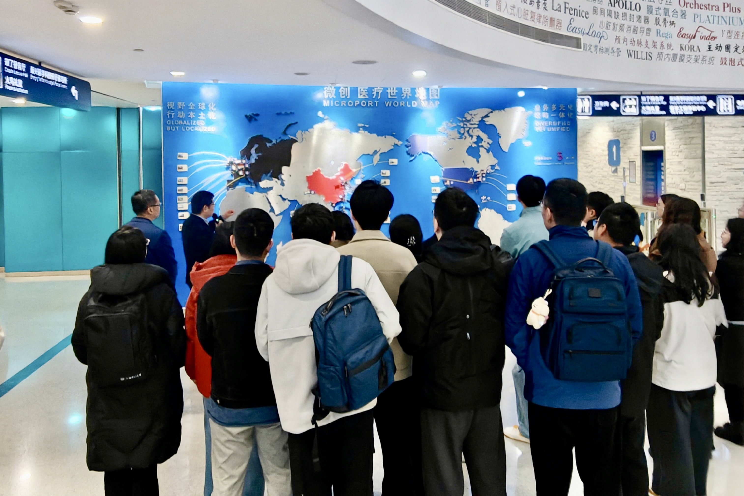 活动伊始,师生一行步入微创园区,春日暖阳下的庭院草木葱茏、鸟语花香,错落有致的布局处处透着中国传统审美意趣。随后,在张海建的引导下,师生们参观了企业展厅,深入了解微创自创立以来的发展历程,感受其深耕多年的企业文化与品牌理念。展厅内丰富的科研成果,生动呈现出微创在医疗器械领域的前沿探索与技术突破,折射出企业扎实的创新根基与研发实力。